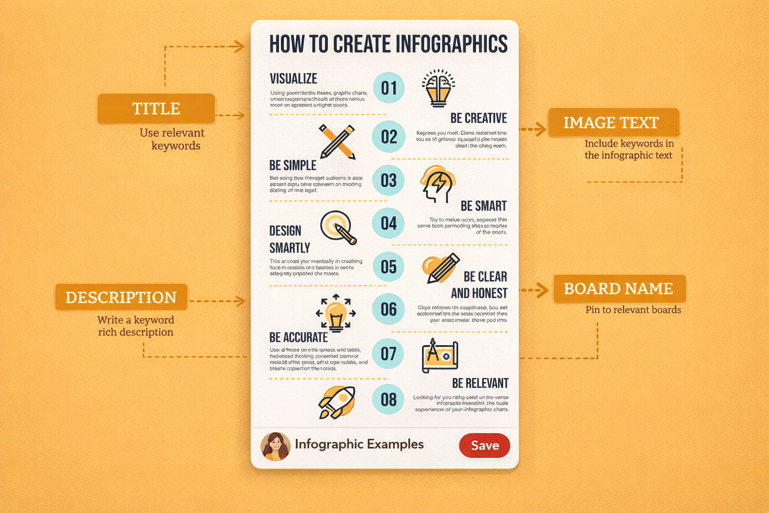 Pinterest relies heavily on keywords to understand, categorize, and recommend content. Because the platform works much like a visual search engine, the way you optimize your pins plays a major role in how easily they can be discovered. When creating Infographics on Pinterest, it’s important to structure both the visual content and the pin information so that Pinterest clearly understands what the infographic is about.