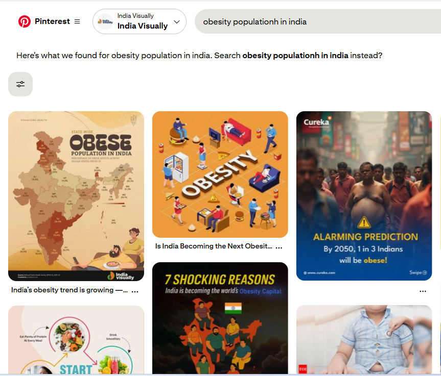 Imagine a user searching on Pinterest for “State-wise Obese Population in India.”They come across a vertical infographic that visually presents the data using a map and clear labels. Because the information is easy to understand at a glance, the user quickly grasps the key insights. They may pause, review the infographic, and save it to a board for later reference. This quick visual clarity is what makes Infographics on Pinterest highly engaging and easy to discover.