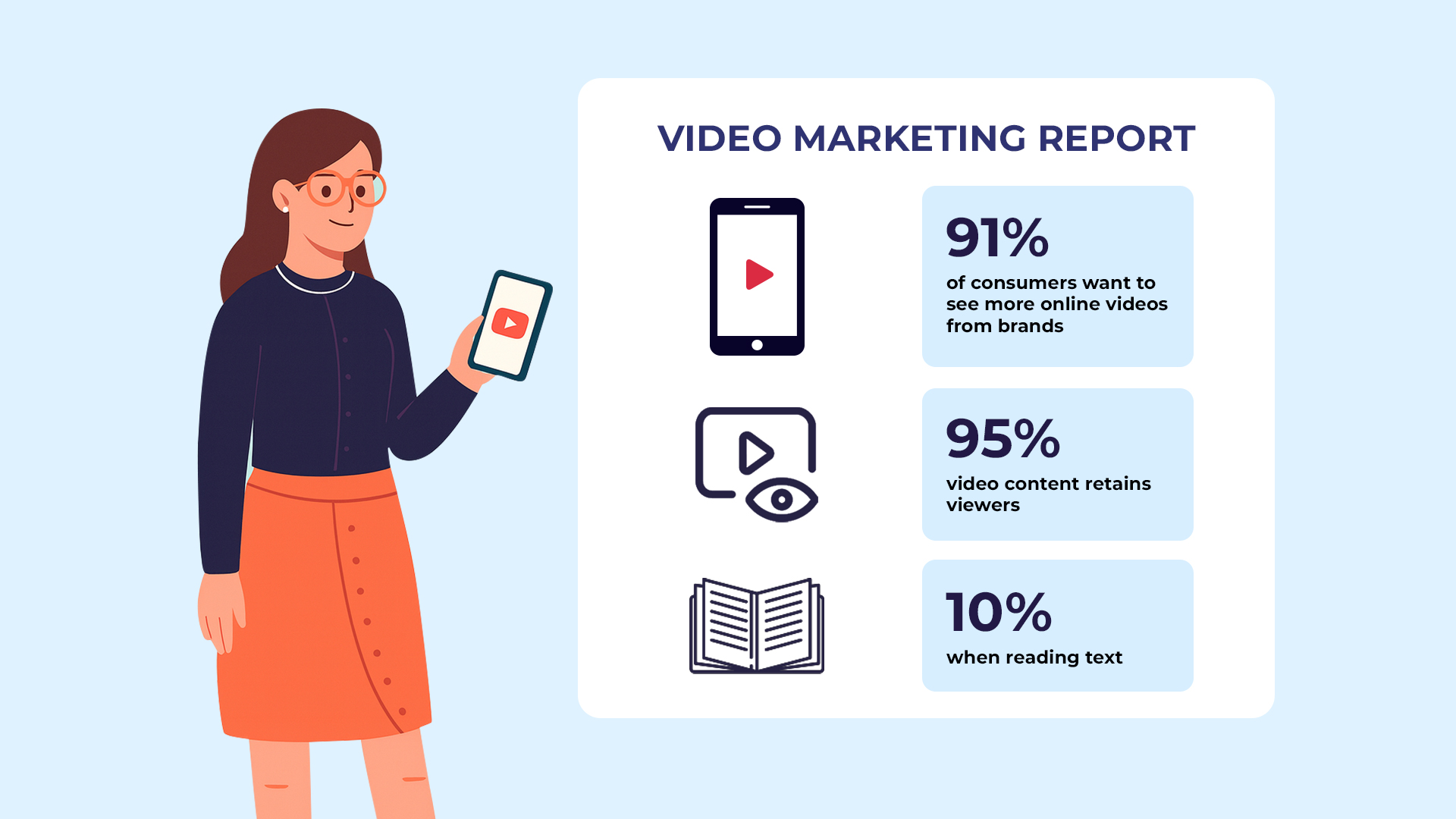 According to Wyzowl’s 2025 Video Marketing Report, 91% of consumers want to see more online videos from brands, and video content retains viewers 95% of a message compared to only 10% when reading text.