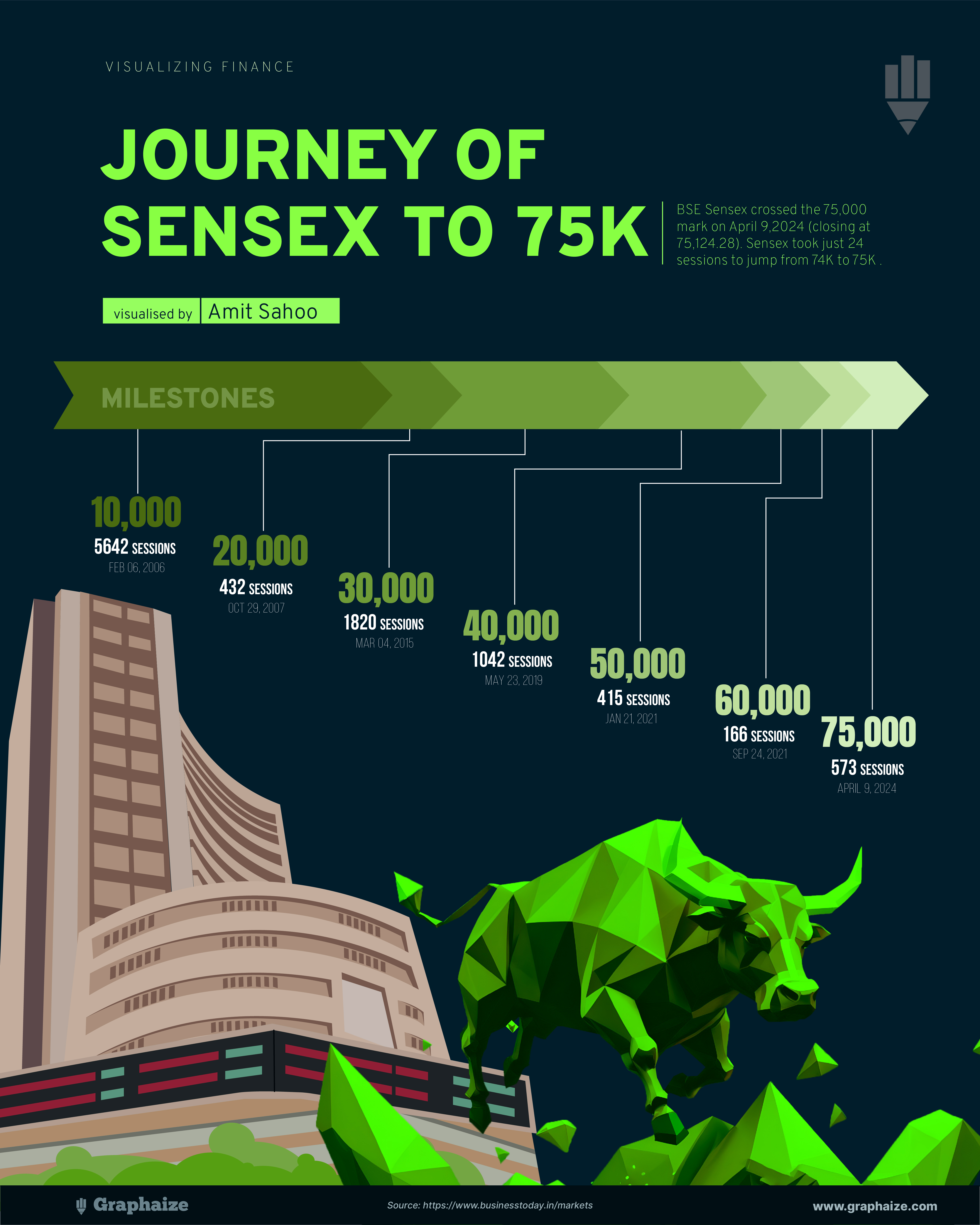 On April 9, 2024, Sensex journey to 75k, a testament to its rapid growth. It took only 24 sessions to climb from 74,000 to 75,000, and less than four months to rise from 70,000 to 75,000, showcasing a remarkable pace of growth.