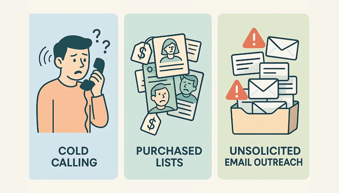 - Unsolicited Email Outreach: Emails sent to prospects who have not opted into your email list or shown any interest in hearing from you.
